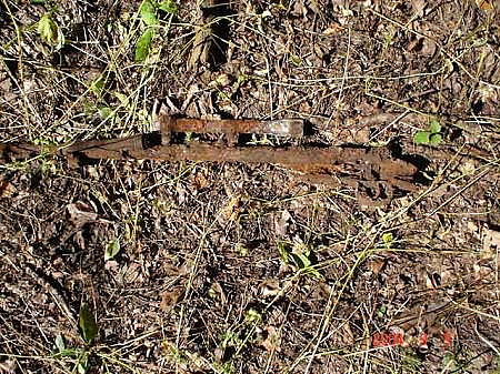 zasílám vám foto z pátečního hledání s Tibeťanem. Jezdili sme po lese jak motorový myši a pouze jeden Mauser a puškohled, jinak ani ťuk. V neděli jsme razili s kamarádem Budkou a kamarádkou Zulu (konečně má přezdívku, vždy když něco najde, tak provádí po lese tanec divokého kmene Zulu). Našli jsme pouze armádní kolo Wehrmachtu celé zabalené v gumě, snad bude sloužit i další generaci. Přeji hodně úspěchů.