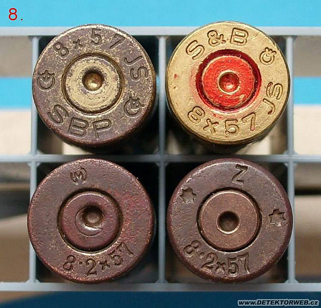 27. 12. 2010, 18:19Ešte doplním ten naboj na obr. 4 v lavo dolu-bez značenia. Vyroba Polte, Magdeburg, expotrna vyroba pre Rumunsko. Ten uxa je skutočne čs. povojnova vyroba s kricím kodom na vyvoz do "horucich" oblastí, aby sa nezistil vyrobca. Je to ešte aj dnes bežna prax. Podla všetkeho to boly dodavky do Izraela v tesne povojnovom období.