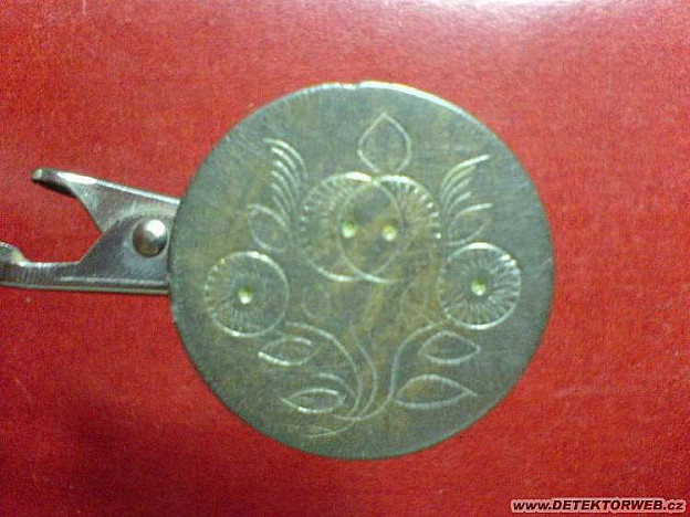 Jakási malá brož a přívěšek s portrétem panenky Marie a nápisem Sancta Maria. No docela mi trvalo než jsem to vyčistil aby tam bylo něco vidět. Nejvíce pomohlo máčení v rostlinném oleji.
