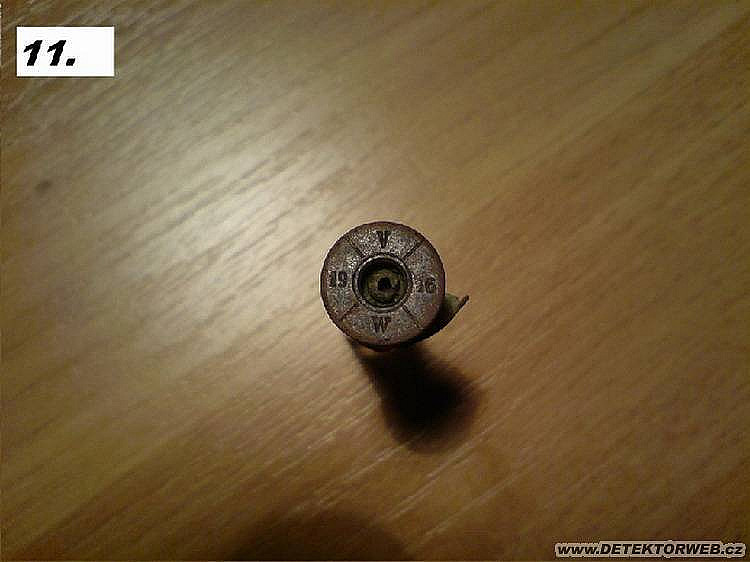 Obr. č 11 : Poškodená nábojnica, neviem určit rozmery, značenie viď foto.