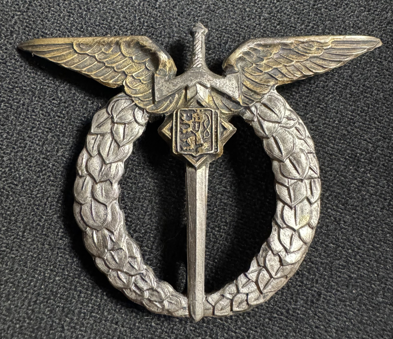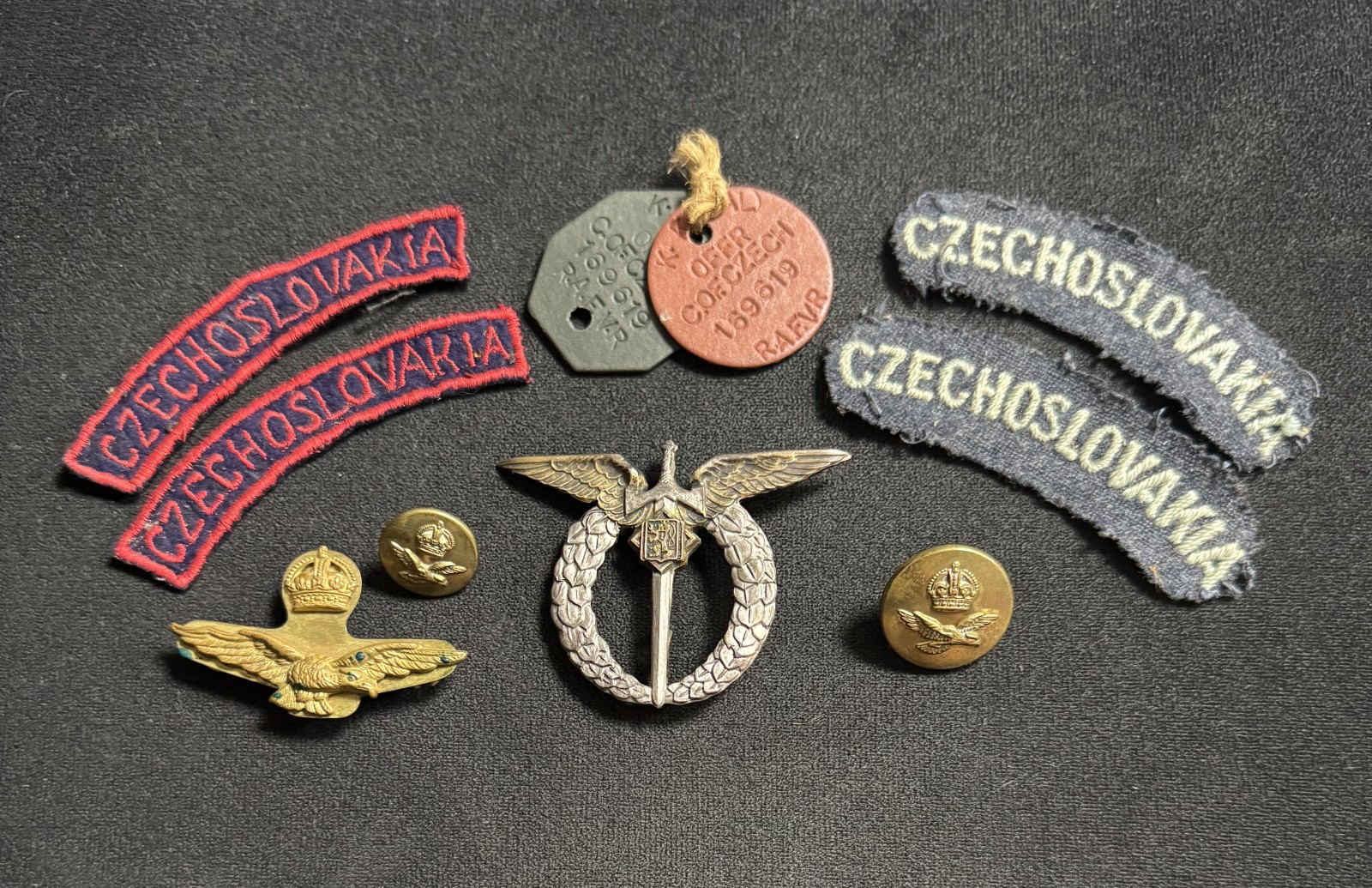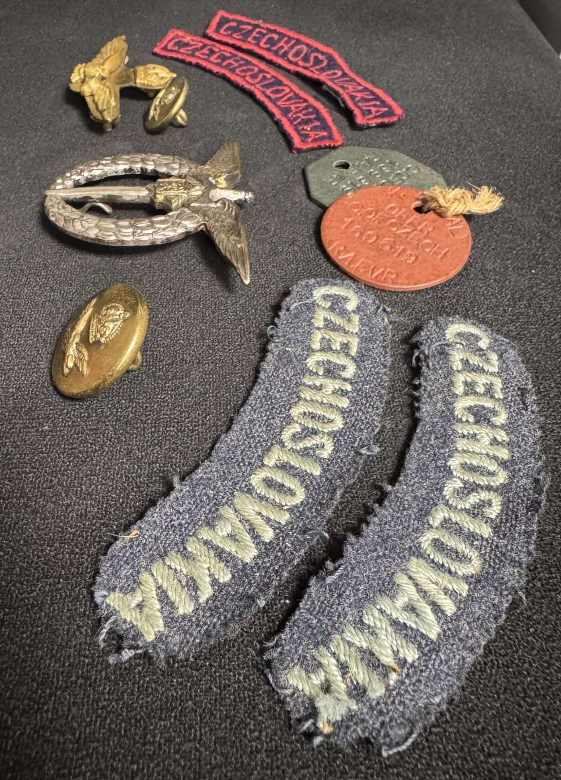 dávám sem na ukázku moji britskou R. A. F. sbírku. Vše, co je na fotkách, patřilo Karlovi Kopalovi, příslušníkovi československého letectva ve službách RAF za 2. světové války. Sbírka obsahuje originální nášivky, odznaky, knoflíky a také originální ID známky z lisovaného papíru. Uprostřed je stříbrný odznak s motivem křídel, meče a věnce, symbolizující čest a odvahu československých letců v RAF. Vše v pěkně zachovalém stavu a s velkou historickou hodnotou.