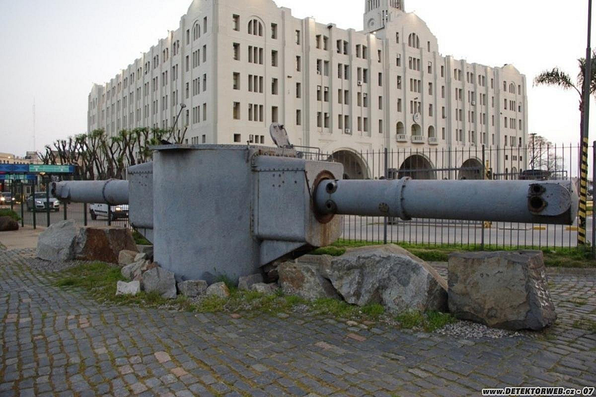 Je to asi 8km jižním směrem a vrak tam pod hladinou stále leží. Z důvodu ohrožení houstnoucí lodní dopravy na řece a také z obavy rabování už uruguayská vláda vynaložila dost úsilí na odstranění vraku. Co šlo vyzvednout vyzvedli. Proto mé první kroky vedly za vyzvednutými artefakty, které jsou k vidění na několika místech Montevidea. Před malým námořním muzeem je umístěn 150mm kanón. Do samotného muzea, kde je jeden sál věnován této události, jsem se bohužel nedostal.