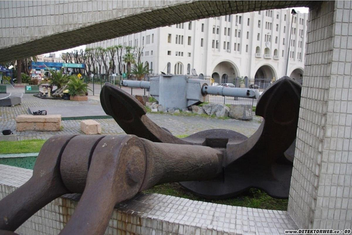 ... a dnes. V pozadí Vrchní velitelství námořnictva. Dálkoměr. Kotva tamtéž. Kotva sem byla umístěna v roce 1964. V pozadí dok, kde kotvil poškozený A. G. S.