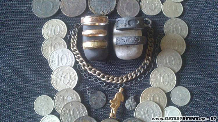 První den jsem byl sice trochu limitován obuví, nechtěl jsem rozmáchat superpohory, které už zdolaly nejeden větší kopec a mnohem více polí, a tak jsem se držel více na písku a do bahýnka vstupoval jen nesměle, ovšem jen do té doby, než bahno vydalo první stříbrný prstýnek. No jo, v tom bahně dále od břehu toho bylo více, a tak začalo to pravé báječné rochnění, boty neboty. První den jsem za cca. 2 hoďky naplnil jednu kapsu převážně soc. mincemi a všemožným smetím, v druhé pak skončily tři prstýnky, sice žádný zlatý, ale i tak jsem byl nadmíru spokojen a domů odcházel s radostí a jasnou vizí na návrat příští den. Druhý den už vybaven holinami a v doprovodu kolegy byl prozkoumán i zbytek zajímavé části rybníku, která ještě vydala spoustu další drobotě, ten žlutý kroužek mi pochopitelně udělal radost největší. Každopádně po těch čtyřech hodinách "procházky" v bahně jsem byl utahaný, jak po 100 kilometrech na kole, ještě že mám letos naježděno. Tohle hledání jsem si doopravdy užil.