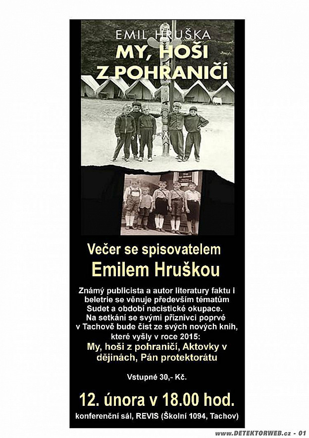 přijďte se podívat v pátek 12. 2. 2016 od 18:00 hod. do Revisu v Tachově na večer se spisovatelem Emilem Hruškou. Na setkání se svými příznivci poprvé v Tachově bude číst ze svých nových knih, které vyšly v roce 2015: My, hoši z pohraničí, Aktovky v dějinách, Pán protektorátu.