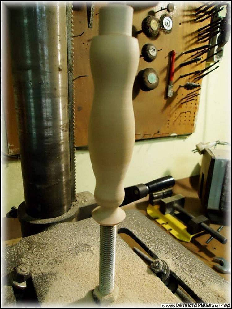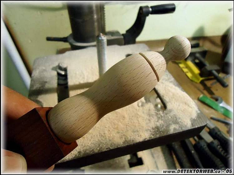 Díky tomu přežil desítky cyklů vedro, mráz bez úhony. Znáte to, bylo mi líto ho tam nechat, tak jel se mnou domů. Když se budu držet při zemi, počítat, že byl vyhozen těsně po válce, ležel tam chudák minimálně 65 let! Ostatní teploměry jsou prokazatelně po něm. armádě. Některé byly značeny razítkem wehrmacht. Doma mám venkovní teploměr z 50-tých let v dřevěném pouzdře. Koukám na něj a říkám si : To dáš... Koupil jsem dřevěnou ručku k nářadí v Baumaxu, z hranolu vyvrtal a vypiloval spodní díl. Ručku jsem obrobil na primitivním soustruhu, na upravené stoj. vrtačce.
