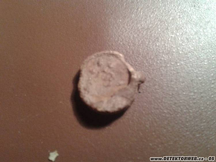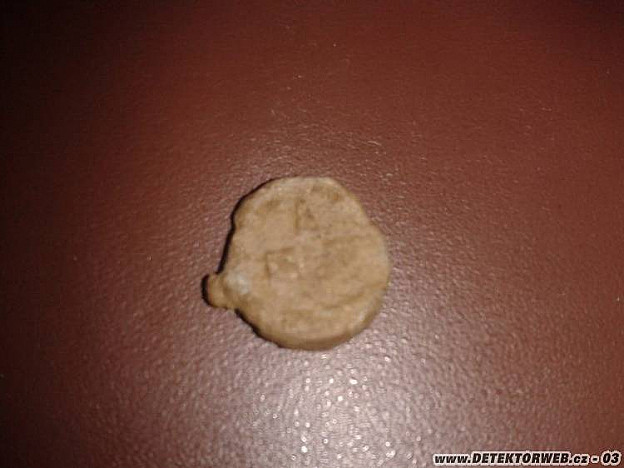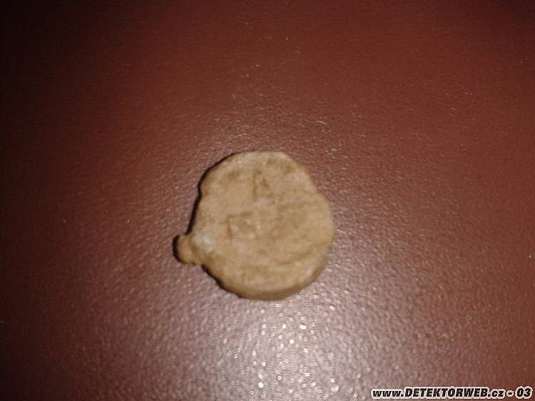 A ještě tu mám olověné cosi - nejspíš plombu - a proto bych také prosil o její určení, pokud to bude možné. Průměr asi 12 mm. Na zadní straně je nějaký trojlístek a okolo nějaké hvězdičky/tečky nebo co.
