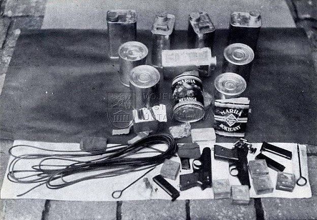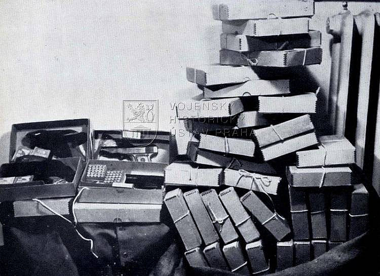 Pistole a střelivo zadržené ve Vidnavě a při následném vyšetřování. Zbraně, střelivo a nenápadně balené výbušniny s příslušenstvím nalezené ve Valašském Meziříčí. Pistole Walter se střelivem a potřebami na čištění z nálezu ve Valašském Meziříčí. Rozložený samopal Bergmann MP 18/I zajištěný v Horním Dvoře v Jindřichovicích na Krnovsku. Detail pouzdra závěru jednoho ze samopalů Bergman. Sestavený samopal Bergmann (bez zásobníku) z dodávek abwehru. Zásobníky do samopalů Bergmann s textilními pouzdra, které bylo možné zavěsit za opasek. Krabičky se střelivem do samopalů Bergmann. Detail německých ručních granátů z dodávek abwehru. Fingovaná nádoba na autoolej s výbušnou náplní. Zdánlivě běžné marmeládové konzervy, ve skutečnosti maskovaná výbušnina. Místa nálezu zbraní a trhavin v kostele sv. Trojice ve Valašském Meziříčí (označena číslem). Kostel sv. Trojice ve Valašském Meziříčí na snímku z roku 1938.