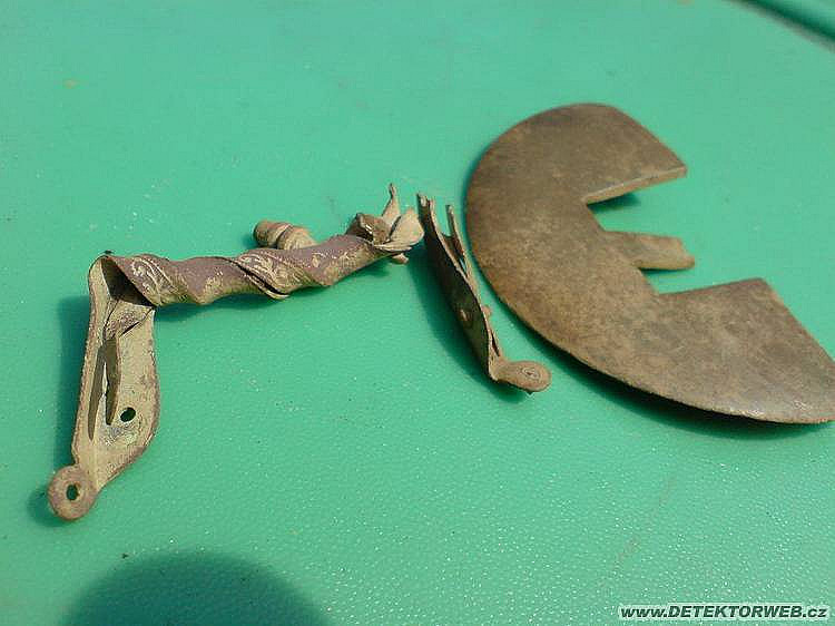 Zdravím obec detektorářskou, po delší době jsem vyrazil na chvílli, na dovolenou, počasí tento víkend bylo opravdu horké, ploužení po lesích, tahání víček od piva, hilzen a starých 1 a míň kreuzeru..., s hmyzem se potýkající jsem opustil tuto, zastíněnou lokalitu a pustil jsem se do kopečka nedaleko moravské metropole s hezkou vyhlídkou že si trochu odpočinu, po cestě jsem zobal špendlíky trochu přezrálé, ale vynikající.. detík jsem vyladil jenom na barvu s tím že v tehlé tvrdé udusané zemi předešlými dešti a zapražené několika dny horkého slunka moc rýpat nebudu... pár metrů pod vrcholem signálek tak uprostřed stupnice, trochu jsem se přemáhal, jestli to zas nebude víčko z premiových pivovarů a potom jsem začal betonovou zemi dobývat bodákem, v pár centrimetrech se vynořila torza, ale čeho nevím. Typoval bych na nějaké přezky, jedna zdobená, bohužel už na dvě části vypadá to na hodně jemný mechanismus zapínání dokonce se to ještě hýbe, překvapilo mě i to jemné zdobení na tom zkrouceném plíšku.. vůbec, jsi netroufám určit období... napadlo mě něco z napoleonských válek? Nebo ještě starší?? Rozměry jsou asi 7cm krá 4cm té ploché půlky, ta kroucená má asi 5,5 krát 3cm, leželo to tak 10cm vedle sebe. Dále něco pro válkaře posílám fota napatinované Mp 44 čínského airsoftu, je to celokov a dřevo pažba, byla hrozně nalakovaná, tak jsem trochu pokutil, jinak to střílí asi 130m/s takže plechovku od piva to na 10 m rozstřílí na cimprcampr, chodí to dávkou i jednotlivě a nabijete do toho asi 500 kuliček, je to lepší zábava než vzduchovka naštěstí 5000 BB stojí asi 250kč. Poslední příspěvek je staré foto po otci mého kamaráda evidentně těsně po válce, památník je tvořen BF 109 G a všichni naši mají kolem ramen Mp40,ale zase nevím kde by to mohlo být??? Možná Plzeň Bory?? .