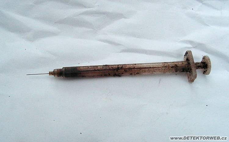 posílám na ukázku fotky toho, co se také dá najít v lese. Po půl hodině hledání signál jako železo, asi tři metry od silnice u křižovatky s lesní cestou. Odhrnuji nohou listí, odkopu asi 5 cm hlíny a zkouším jestli nález není vykopaný. Signál se změnil a vypadá to, že je nález venku. Beru hlínu do ruky. Detektor nic. Zkouším další hrst hlíny a v tom cítím, jak se mi něco zapíchlo do ruky. Nález je však v ruce. Odkládám hlínu v domění, že jsem se píchl o trn. Rozhrnuji hromádku a najednou vidím ten hnus. Úplně mě zamrazilo. Tím končí naše hledání. Skáčeme do auta a jedeme na pohotovost. Tam nás posílaji na infekční oddělění do nemocnice. Odbírají mi nultý vzorek krve a posílají mě do poradny HIV. Po šesti odběrech krve, asi půl roku, si můžu oddychnout, že nejsem nakažen. Možná byla injekce starší nebo ji tam odhodila fetka, která neměla HIV nebo snad houbař, který si píchal v lese inzulín? Kdo ví... Každopádně je to hnus, mějte všichni lepší nálezy než jsem měl já.