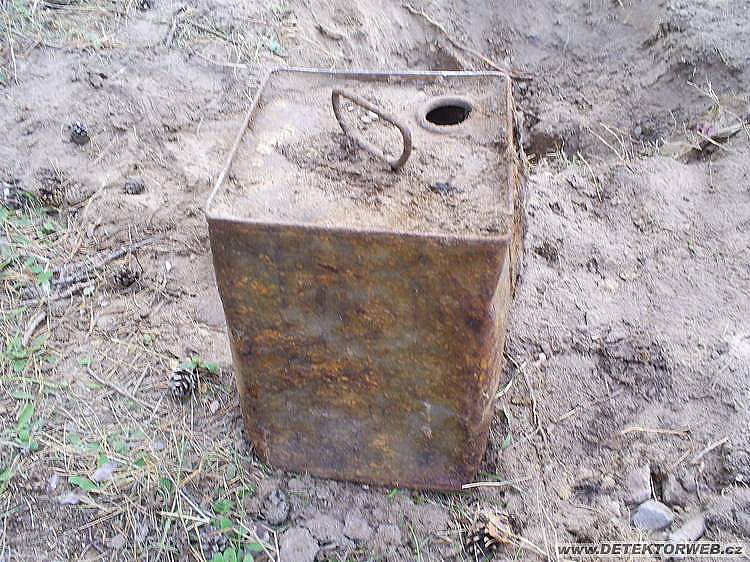 22. 09. 2007, 22:31Stejný kanystr mám doma, je tmavozelený kolem dokola je žlutý pruh a na něm nějaký německý nápis švabachem, možná je od petroleje, já v něm mám vyjetý olej.