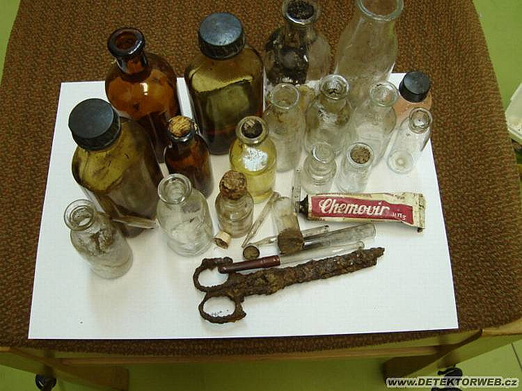 5.Další nález je spíše zajímavost. Pod jedným pařezem signálek na kov a ejhle, felčarský vercajk. Někdo si ho za války zakopal a pak na něj zapoměl. Některé lahvičky jsou ještě plné.