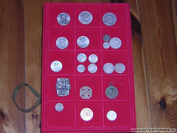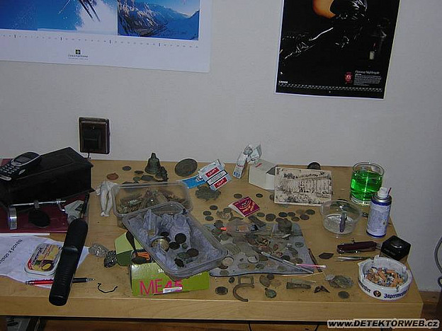 Tady jsou nálezy z Rusko-Pruské bitvy. Místo samá díra jak kdyby tam bojovali před týdnem. (1krejcar, knoflík, kus nějakého zvonku, malá a velká lžíce něco co nevím jak pojmenovat)