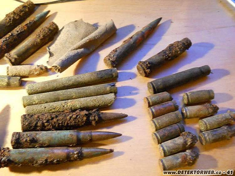 maraxp : myslis asi podle toho pouzdra na naboje to jsem nasel pod jednim hradem zakopany min 50 cm z boku na strani, v kazdym pouzdru bylo narvano 15 x 3 naboju a ty pouzdry byly 2,ale mel jsem pak docela strach na co narazim tak uz jsem dal nekopal a jinak vsechny naboje jsou z hor a par veci z 1 svet. jsem nasel na jednom fleku cca 20 m2 a tam byl ten odznak neco jako (nadrazni bahn) a ta flaska 1918