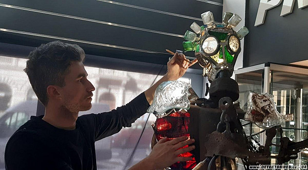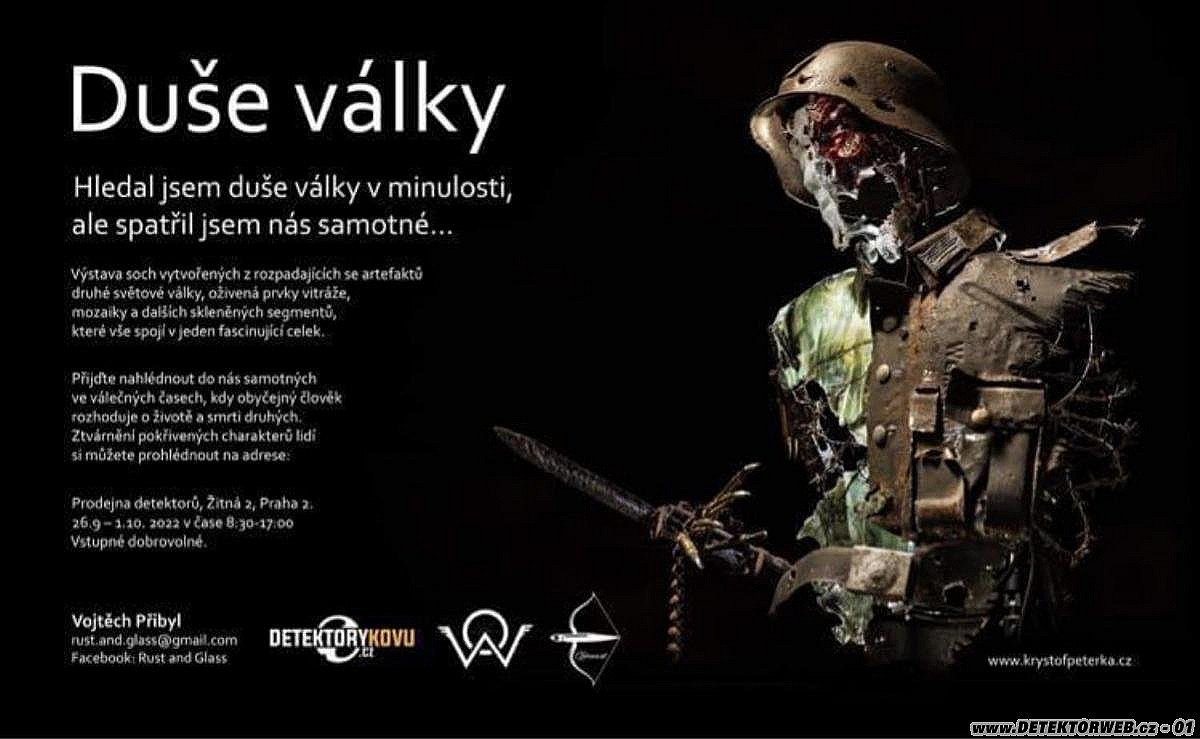 Vojtěcha Přibyla. Z rozpadajících se nálezů a půdovek, které sám našel či získal od přátel, vytvořil především čtyři pozoruhodné sochy na určité téma (Obsazení Polska, Udavačství, Mnichov a Předzvěst války). Vojta je profesí vitrážista, takže skvěle ovládá práci se sklem i kovem, magie soch stojí především na překvapivém spojením právě vitráže, mozaiky a dalších skleněných segmentů s válečnými nálezy. Oko hledače zároveň mlsně :-) přeskakuje po nejrůznějších detailech, jako jsou třeba otisky tankánů a jiných odznaků do skla.