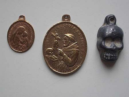Jestli byste někdo věděl něco o těch "medailích" a svátostkách, "známce" a té Petřkovické venuši alias olověné tchýni, (poslední foto), dejte pls vědět do fóra. Belgická medaile je z Al, ta druhá je Cu, a chlap má dlouhou bradku. Ten 1.knoflík s desítkou má tvar jedničky shodný s jednokrejcarovou Františka. Díky a luxu zdar!!!