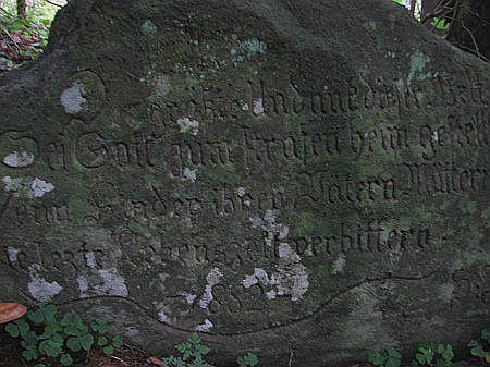 A jako konečnou zajímavost předkládám foto německy popsaných kamenů v lese (Nejedná se o dovezené kameny. Tyto jsou místně příslušné a původní). Pokud by někdo věděl, proč si někdo činil tu práci aby studený kámen přetvořil k hovořící věci, popř. chtěl přeložit text (pravděpodobně se jedná o básně) nechť se ozve na FÓRUM.