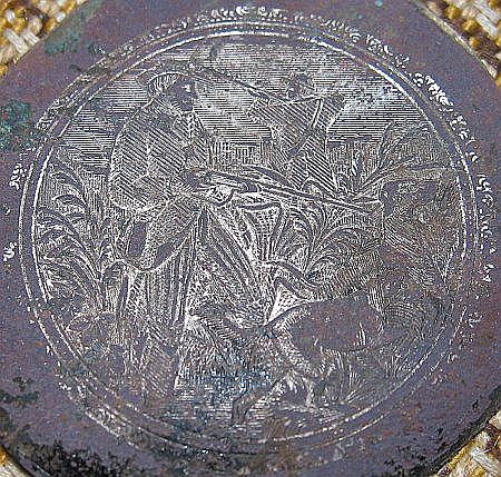 Pěkný a zajímavý je také postříbřený náboženský přívěšek a zároveň obrázek (původně tam určitě byl) na postavení, tzv. univerzál - datace?? . Také víčko z hodinek (cibule) s rytinou lovců při lovu zvěře + nějaké RU mince.
