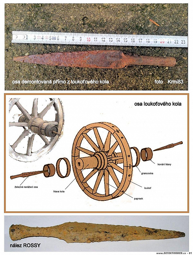 V nálezech se občas objeví železná špice, o které se spousta lidí domnívá, že se jedná o železný hřeb dřevěných polních vláčecích bran. Protože jsme to zde na DW kdysi dávno řešili, nedalo mi to, abych znovu nenapsal, o co se jedná. Mám k dispozici i fotografii této osy, přímo po demontáži z loukoťového kola, od kolegy Krmi83. Doufám, že se na mne nebude zlobit, že jsem ji v koláži použil. Tyto osky byly narážecí, tedy pevné. Aby v hlavě kola, která byla podstatně delší než klasická hlava, držely, byly na špici mnohdy vybaveny záseky. Někdy to u nálezu není patrné, ale uvidíme to většinou až po očištění. U železných hřebů dřevěných vláčecích bran jsou naopak záseky na hřebu v nejširším místě. Takovéto osy se používaly například u loukoťových kol dřevěných trakařů, ale i u dřevěných polních válců, jak na to mnohokrát upozorňoval kolega schmiede.ROSSY