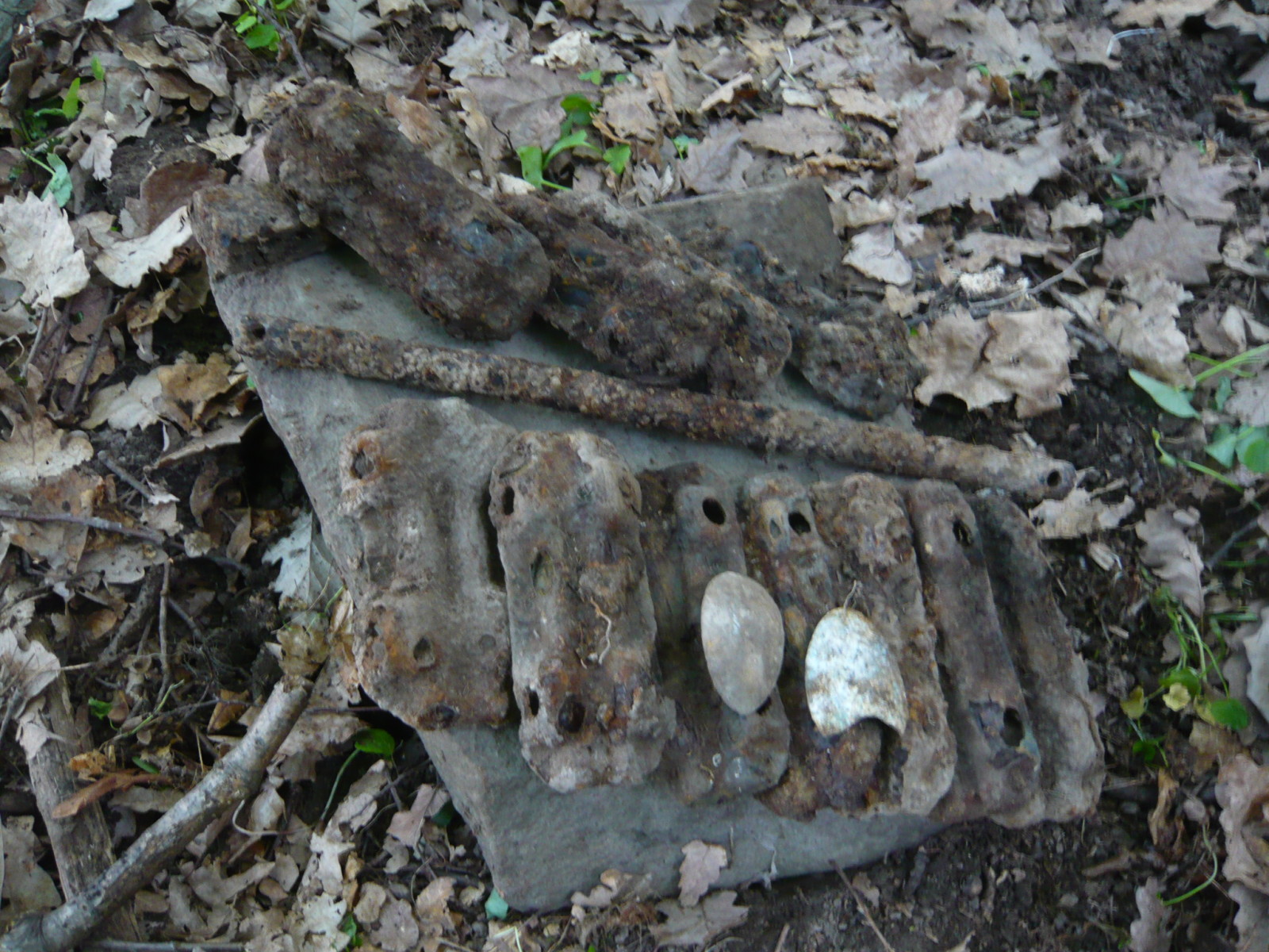 Po více než 4 letech jsem zavítal na místo u obce Mankovice, kde jsem na okraji lesa kopl zřejmě zbytky gumových botek na kolopásovou techniku. Myslel jsem si, že jsem to tam vybral. Nálezy jsem uložil u stromu a odešel. Teď po 4 letech u stromu nic a v zemi ještě pár kousků zbylo. Ani jeden se zbytky gumy. Ten čep na spojování článků pásu (43 cm) neumím zařadit. Možna pásový traktor, ale to by byla velká náhoda, aby to bylo takto u sebe. Lotovka je odjinud. Během tohoto hledání se pokazil detektor - řeším opravu.