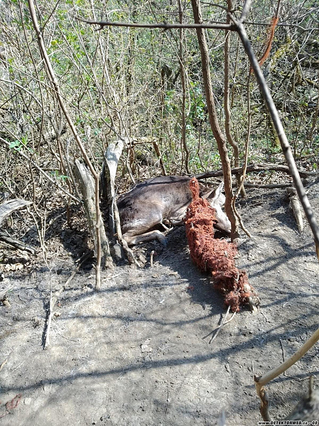 Nakonec tu mám opravdu nechtěný nález, který je pro zamyšlení nad lidskou bezohledností. Dnes, kdy jsou v každé obci sběrné dvory a kontejnery na tříděný odpad, mají někteří jedinci potřebu vyhazovat smetí do přírody. Na Velikonoce mne Rex zatáhl do těžko schůdného žlebu hustě zarostlého křovím. Tam byl mladý daněk, který si někde pohrál s kusem starého koberce, namotal si jej na paroží a zachytil se o houževnatý výhon keře. Ještě žil, ale podle jeho vyzáblosti a udusaného okolí bylo znát, že je tam už několik dní. Podařilo se mi ho vyprostit, ale neměl už sílu odejít. Šel jsem domů pro otce, aktivního myslivce, ale po našem návratu už nedýchal. Škoda.