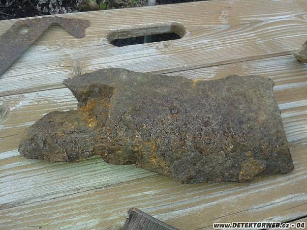 Podle mě hodně důležitý detail můžou být ta šoupací dvířka průzoru-střílničky. Mají jemný radius a po stranách kolejničky a posunovala se asi do strany. Z toho usuzuji, že byla na nějaké věži. Dál tam vidíte kusy litého pancíře, rovněž s radiusem. Vypadá to jako velitelská věžička notně roztrhaná výbuchem. Ten podlouhlý kus má tloušťku asi 4 cm. Všechny hodně rezaté "plechy" jsou pancíř cca 8-10 mm, ale vnější vrstvy kovu se rozpadly při oklepávání na prach. Zajímavý je ten kus s tlustším pertlem ve tvaru oblouku, připomíná mi to vnitřní stranu blatníku u hnacího kola menších tanků. Ze začátku jsem jásal, že mám kus Škoda LT 35, když jsem viděl ty dvě řady nýtů, ale dnes už si to nemyslím. Vodítkem by taky mohl být kus té stupnice náměru či odměru. Je to mosaz. Coby měřítko vemte ten mauser, má asi 8 cm. Tak jsem zvědav, kam se dostaneme. Osobně se nejvíc držím těch dvířek s kulatou dírkou, ale ať sonduju techniku jak chci, na nic podobného jsem nenarazil.