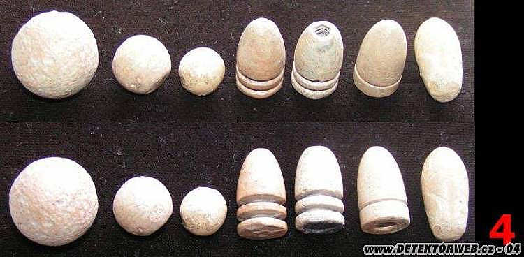 4 - olověné koule z rakouských kartáčových střel, šrapnelů a pušek (jen ta úplně v pravo je z pruské jehlovky)