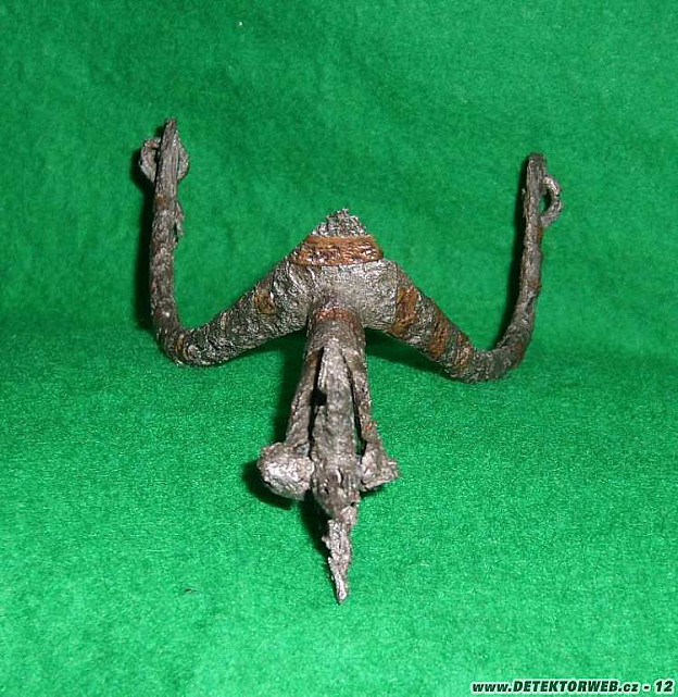 Poslední fotky věnuji jednomu pěknému železu, které mi potvrzuje, že i železo se vyplatí kopat. To použité slovo vyplatí nemyslím samozřejmě z pohledu finančního, ale sběratelského. Ostruha je zdobená plátky mědi. Podle známého, který pracuje v muzeu je asi z konce 15. století nebo začátku 16. století. Pokud by někdy v budoucnu dělali nějakou tématickou výstavu k danému období, tak by si ji došel půjčit. Momentka je z mobilu.