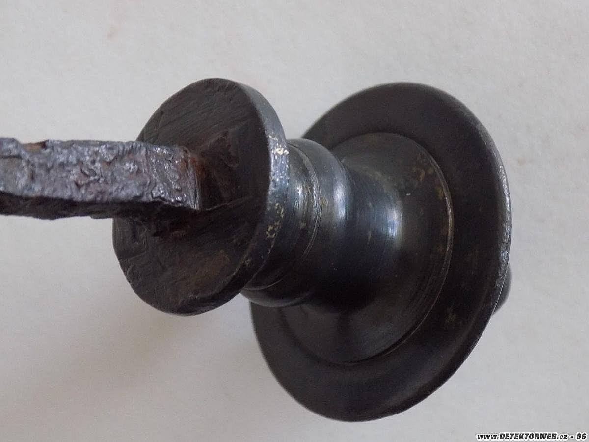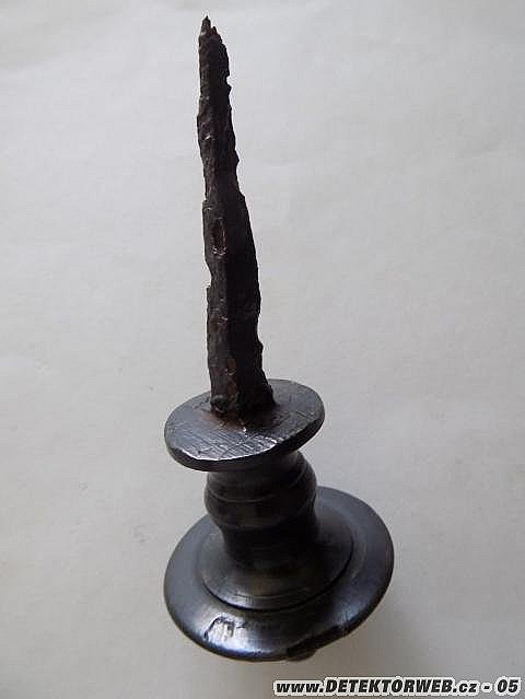 Zdravím všechny s prosbou o identifikace pro mne neznámé věci. Materiál asi bronz a železo, poměrně masivní a těžké 0,2 kg, celková délka 12 cm, železný řap čtyřhran v nejširším místě 0,6 cm. Pěkná zelená patina. Nalezeno hluboko v lese v hloubce 26 cm bez dalších nálezů. Setkal se někdo s něčím podobným? Děkuji za každý koment.KARLOVIC