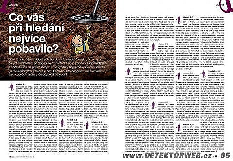 "Co vás při hledání nejvíce pobavilo? “ je otázka, kterou jsme hledačům položili v další naší stálé rubrice Anketa. O svém nálezu bronzového „kusu historie“ vypráví hledač Veny 75 v článku Můj velký poklad. Po stopách prvoválečných bojů v Karpatech se ve své poutavé „retroreportáži“ Karpaty po dvaceti letech… vydává náš kmenový autor acci. Depot turistických známek dal hledači Kódlovi nahlédnout do historie jedné šumavské horské chalupy a vy si o tom přečtete v reportáži Vzpomínka na Hrnčíře. Nepředstavitelné množství zlata, stříbra a drahých kamenů ukryli Němci na konci války před blížící se Rudou armádou. Jak úspěšně po těchto pokladech pátrají hledači u našich západních sousedů se dočtete v článku Víc zlata než na Ostrově pokladů. Na Svatou Horu (u Příbramě) vás zavede dvacátý první díl Soupisu čs. svátostek od Bedřicha Přibila.