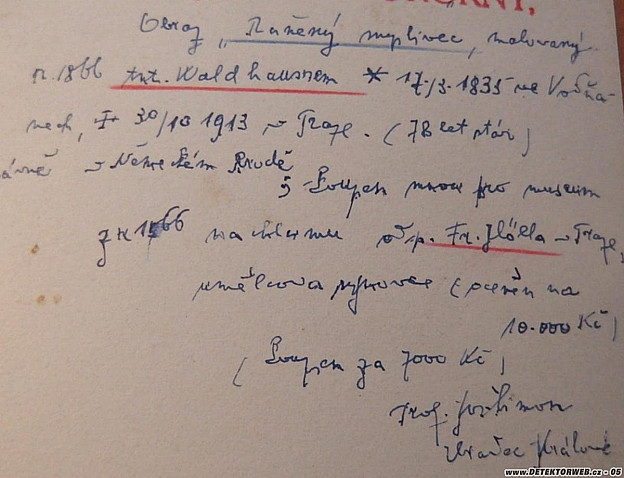 Tento obraz jako tematicky velmi vhodný zakoupil v roce 1936 k příležitosti slavnostního otevření nového Válečného musea 1866 na Chlumu jeho štědrý donátor profesor S. Synovec malíře, který byl vlastníkem pozůstalosti, požadoval za něj původně 10.000 K. S ohledem na místo, kde bude obraz vystaven, pak slevil na částku 7.000 K. Jak píše vlastnoručně zde kupující profesor S. , který jej po zakoupení věnoval tomuto museu, cena za obraz i po slevě to byla ve své době skutečně mimořádná! Uvědomíme-li si, že cena novostavby musea činila něco málo přes 39.000K. Nebo, jako srovnání zde přikládám dobové ceníky v té době již exkluzivních motocyklů. Obraz byl umístěn ve zmíněném zde museu do 50tých let 20tého století. Pak byl jako nadbytečný odtud odvezen do depozitáře muzea Východních Čech na adresu Nábřeží Protifašistických bojovníků č. p. 465 v Hradci Králové. Kde jej tamní "odborníci" posoudili jako "ideologicky závadné dílo nevhodné prezentace na veřejnosti" a vyřadili jej proto ze své evidence. Protože se jednalo o "výtvarné dílo na plátně", nebylo vyhozeno z okna muzea na korbu nákladního vozu Sběrných surovin, tak jak v té době bylo běžně a pravidelně nakládáno s jimi vyřazenými papírovými archiváliemi a knihami. Za cenu plátna a rámu byl povolen jeho prodej v tehdejším národním podniku Klenoty. Tehdy provozujícího i bazar v tehdejší Švermově ulici v Hradci Králové. Obraz si tam jako motiv "pytlákem zraněného myslivce" zakoupil do své hájovny fořt, kterého rodina jej vlastní dodnes... ! Pravost autorství tohoto obrazu je známým pražským galeristou, úředním znalcem a majitelem aukční společnosti ověřena. Písemná smlouva nynějších vlastníků o předkupním právu z budoucí pozůstalosti s jednou věhlasnou vojenskohistorickou evropskou institucí uzavřena. Tento obraz bude tedy jednou viset v sále po boku jiného světoznámého protiválečného obrazu.