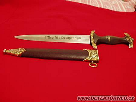 25. 05. 2008, 11:13U této dýky by musela být damačková čepel s opačným způsobem leptu a nápis vykládaný zlatem. Po stramách motta "Alles fůr Deutschland" pak dubový trojlístek. Pochva byla potažená tečkovanou hnědou kůží a ručka se speciální úpravou pro efekt tygrovaného vzoru. Pokud by se jednalo o originál kování, pak k němu velice neodborně dodal obyčejnou čepel a ručku z běžného modelu vzor 1933.