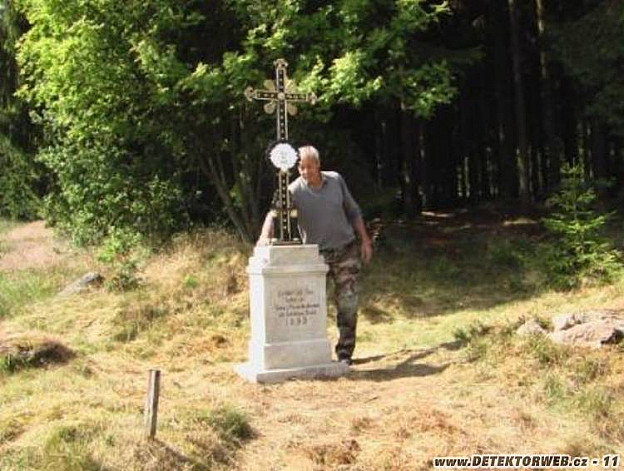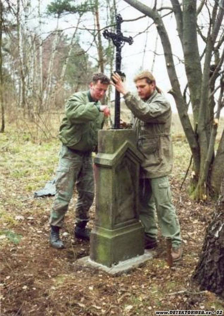 V blízkosti tohoto křížku bylo v dubnu 1945 zavražděno patnáct vězňů z transportu smrti z KT Buchenwald. Detektorem se nám podařilo najít všechny rozlámané kousky litinového křížku. Po opískování bylo nutné vymyslet a vyrobit podpěrnou konstrukci. Křížek složený z osmi rozlámaných dílů je na svém původním místě opět v plné kráse. Pokud vás bude zajímat to, co se zde stalo v roce 1945 nebo jak probíhala oprava křížku, podívejte se na: