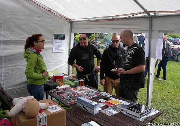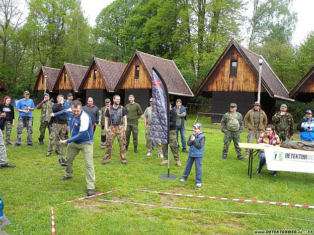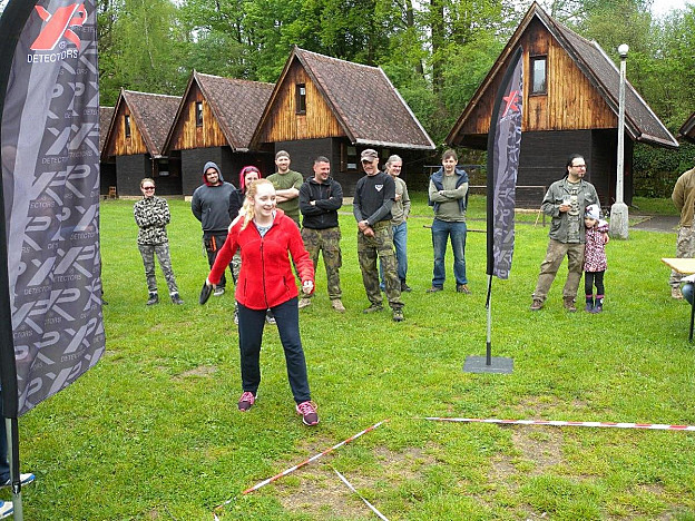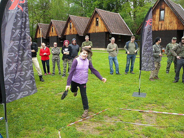 Tradičně se začínalo „královskou disciplínou“ - hodem detektorem. Letos jsme se s trochou nostalgie vrátili ke starému dobrému a lehčímu „klacku“, který sloužil - tedy létal - věrně dlouhá léta a pamatuje ještě pekelné hody na srazech v Pekelných dolech. Tudíž se především v kategorií "muži" čekal útok na dosavadní rekord 15,30 cm, který drží nizozemský borec RAY. To se však nestalo. Železného veterána poslal Ray do dálky „pouhých“ 12,20 m, což stačilo jen na třetí místo. Na „stříbrné“ příčce se usadil SYKY (12,58 m) a po zlatě sáhl RUFUS výkonem 13,55 m. V kategorii "ženy" obsadila třetí místo (loni druhá) JARULI (5,33 m)… …stříbro získala VERČA (6,12 m) a zlatý hod patřil letos ALENĚ (6,80 m). Všem chrabrým a zdatným účastnicím, které ani při špičkových výkonech neztrácely glanc a půvab, gratulujeme. V kategorií „Děti a junioři“ se házelo pouze s tři kilogramy těžkou cívkou odmontovanou z nového, letos nesoutěžního Deuse a odvahu našli i ti nejmenší špunti.