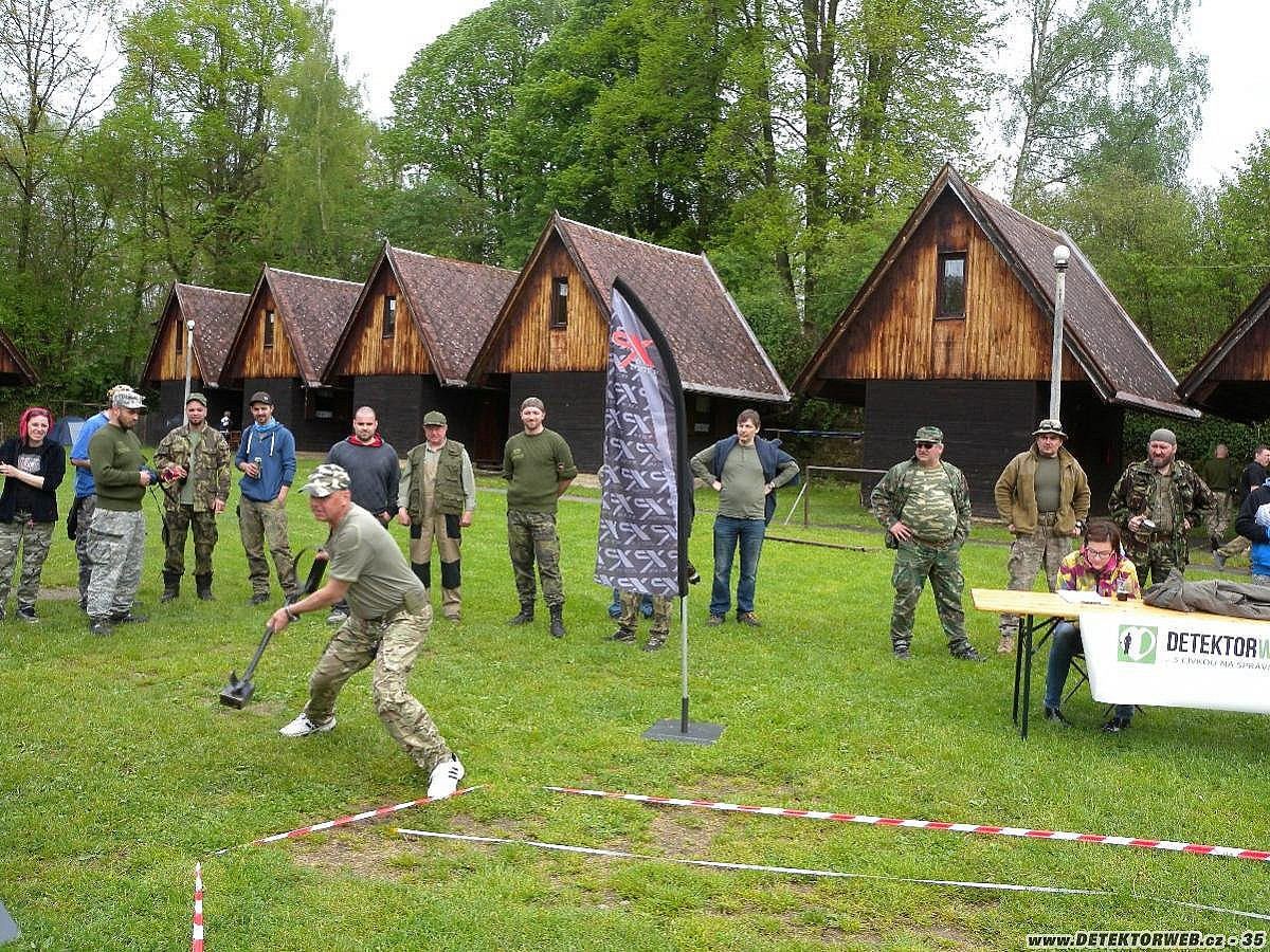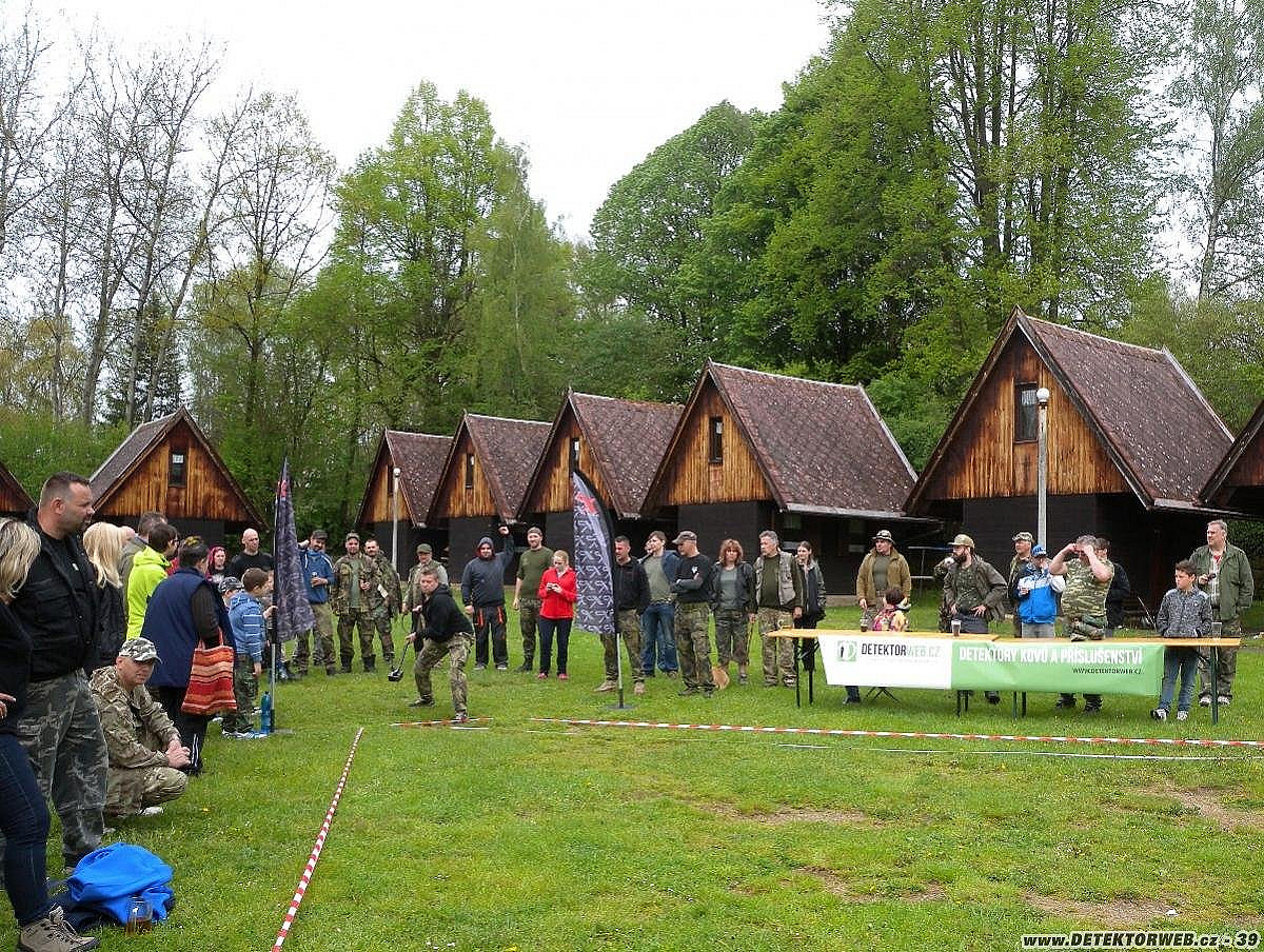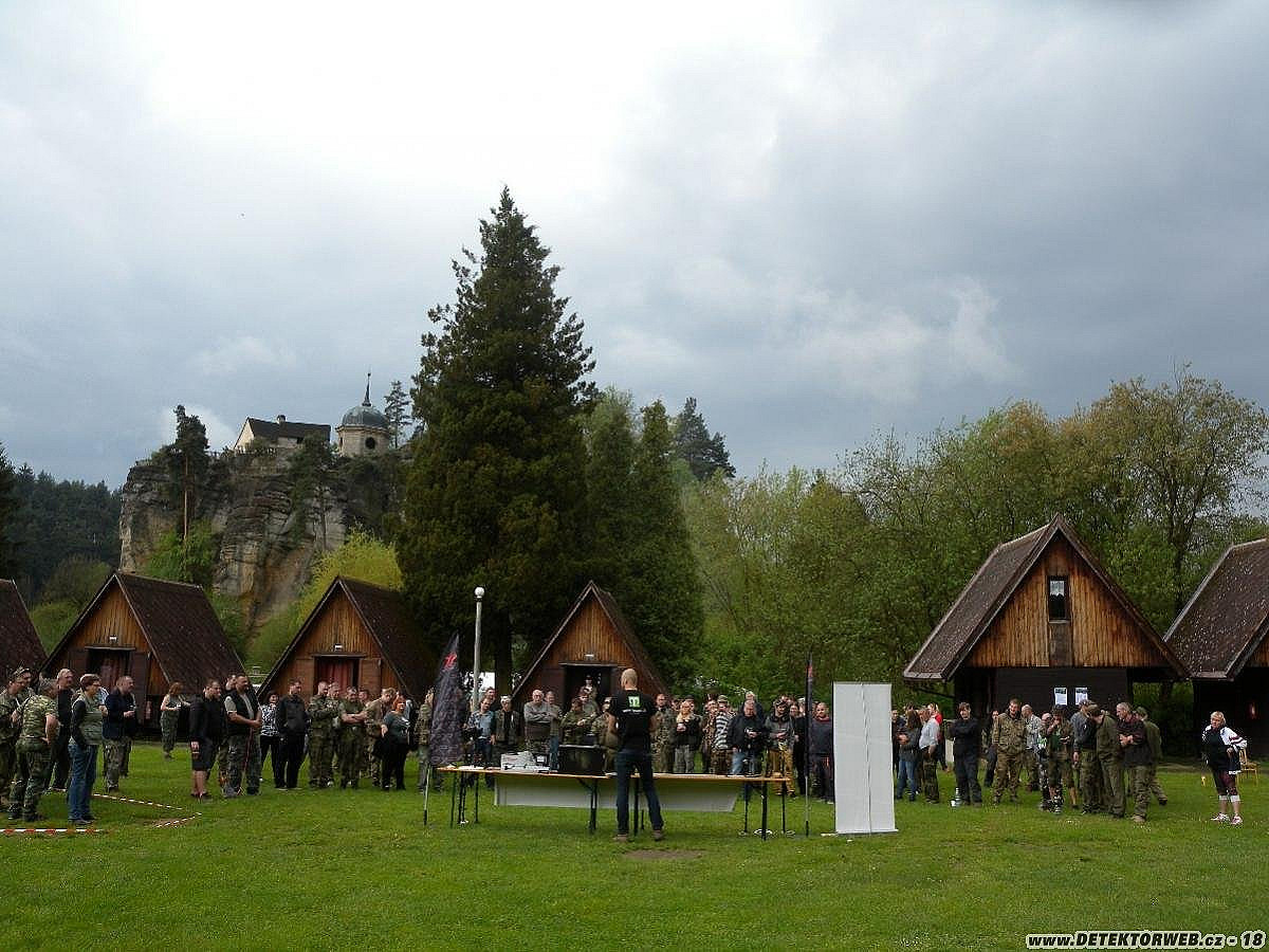 Registrace díky našim „hosteskám“ Šárce a Evě a ubytování v chatkách, penzionech i stanech díky pečlivosti i respektuhodné maskulatuře :-) správce Viktora proběhly svižně, z bufetu zapěnila pípa s Plzní a Rychtářem, zavoněly prskající špekáčky, držťková, curry wurst, znalce lákala pestrá nabídka lahodných kanárských rumů… I když v pátek občas i zamžilo, větší deště se nám vyhnuly obloukem. A tak se mohl v podvečer pěkně rozfajfrovat tradiční táborák... Před tím, co přece jen spadlo na Sloup, bylo možné se ukrýt do prostorných stanů, které měly svou premiéru ve Sloupu loni a které se staly útulným místem pro setkání, debaty, popíjení… … a rovněž místem pro improvizovanou výstavku půvabných černobílých fotografií, které pořídil Tomáš loni na setkání v Protivanově a které si pak mohli ti, co se na nich našli, odnést jako upomínku na jeden příjemně prožitý víkend u protivanovského rybníka. Když o sobotním ránu Miroslav UC Kratochvíl vítal první várku účastníků 14. ročníku setkání hledačů ve Sloupu – další přijížděli v průběhu dne - mraky nad našimi hlavami nám trochu drnkaly na nervy, ale pravdu měli ti, co trousili tradiční průpovídku „z tohoto mraku pršet nebude“. A tak mohlo představení detektorů Makro, XP a Rutus proběhnout pod širým nebem. Když přišly na řadu soutěže, sloupské podhradí již prohřívaly sluneční paprsky.