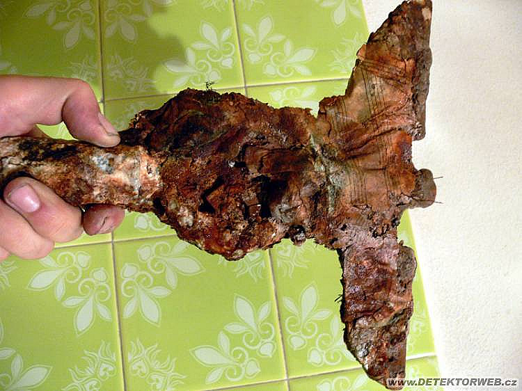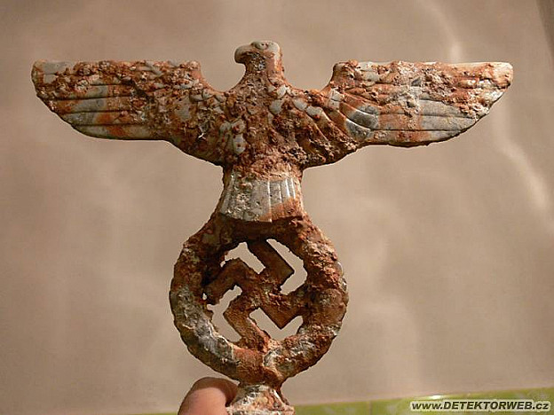 Pak jsem najednou narazil na slabý barevný signálek, a začal jsem kopat. Divné bylo, že jáma byla už asi třicet čísel hluboká, signál sílil a pořád nic. Horečně jsem začal bobrovat, až se na dně objevila hrana z bílého kovu. Nejdříve jsem si myslel, že se jedná o hliníkovou krabičku, ale po obnažení pár centimetrů bílého kovu mi bylo vše jasné. Je to orlice!