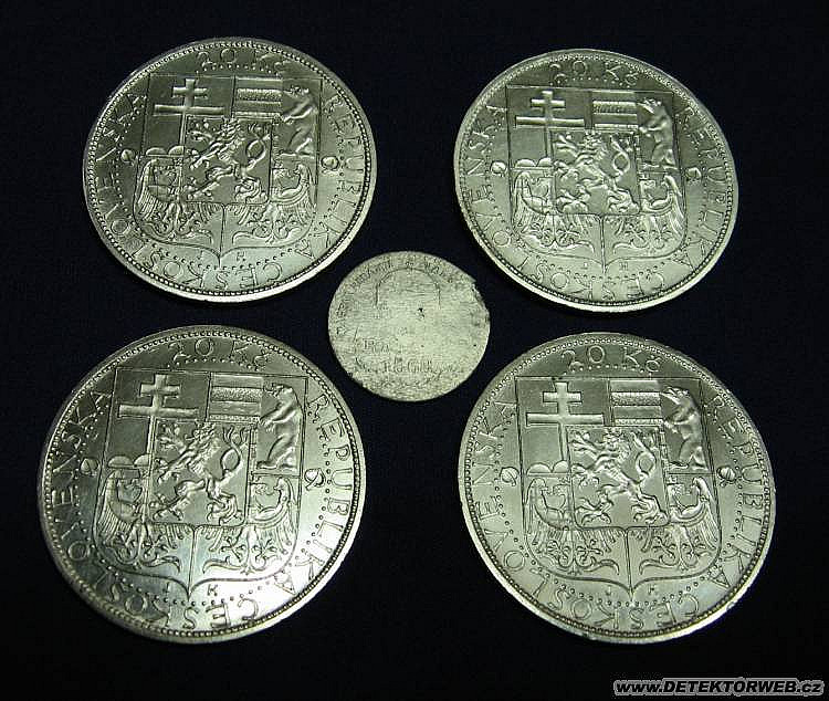 po nějaké době posílám zase pár foteček mých posledních nálezů. Ty 4 dvacetikoruny jsem našel v lese a zřejmě byly i v peněžence a kousek od nich ležel ten zlatý prsten (to asi jen tak někdo neztratil). Všechny mince jsou na první pohled stejné, ale při podrobnějším průzkumu jsem zjistil, že jedna z nich má obráceně boční ražbu. Nevíte někdo, co by to mohlo znamenat? Pak tu mám ještě pár německých minciček, 1 krejcárek a ruku s dopisem, se kterou si nevím moc rady. Možná ji nosil pošťák na šatech.