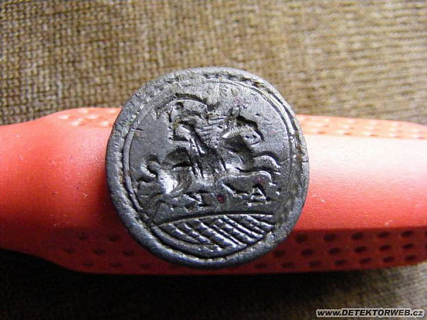 14. 04. 2009, 21:51Rustikální, nicméně pěkná záležitost, jezdec se zakřivenou šavličkou, vzpomínka na boje s Turky, micméně prsten je mladší, XVIII. stol