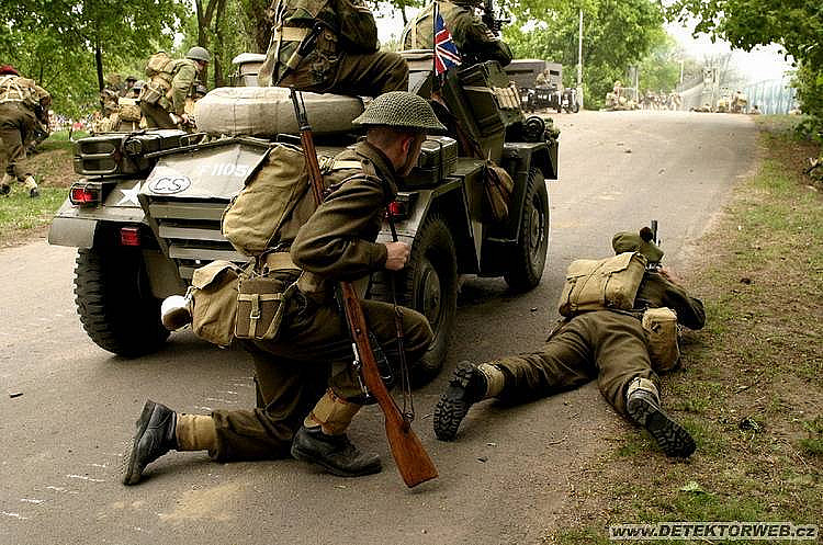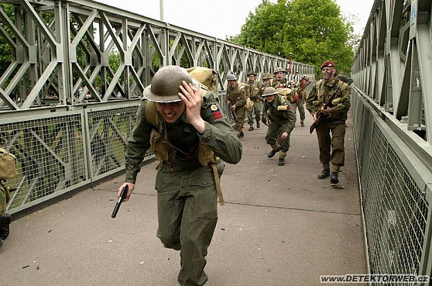 tak jsem se zase jednou zúčastnil jako fotograf akce. Tentokrát to byl PEGASUS BRIDGE v Hradci. Bohužel nemám téměř žádné záběry německého vojska, protože díky spojenecké uniformě (německou nemám), jsem nebyl organizátory vpuštěn mezi obránce mostu. Škoda, ale asi to tak má být. Takže to máte z pohledu fotografa 101. Airborne. Nebylo to tak luxusní focení, jako je třeba na Slivici, u mostu je hrozně málo místa, moc lidí a okolo diváci. Tyhle fotky jsou z digoše, takže mi tam chybí moje oblíbené ultraširoké záběry, ale jako druhej foťák jsem měl klasiku s dvacítkou, nabitou černobíle. Tak až bude čas, tak to naskenuju a hodím na web. Asi to bude jiný kafe. Jsem zkrátka klasik. Hlavně po ránu.