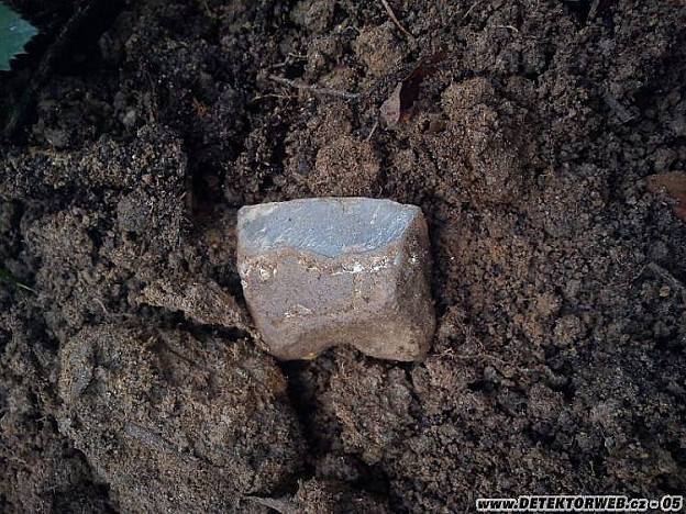 Vypadla tato štípaná industrie, pravděpodobně pazourek zasazený v jakémsi kovu.