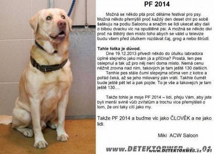 07. 01. 2014, 03:09Zdravím všechny co milují zvířata a přírodu obecně. BENEDEKA jmenovitě. Také jsem nehlasoval, neboť jsem byl skálopevně přesvědčen, že vyhraje právě tato PF. Sám jsem vloni v dubnu přišel o to nejcennější co jsem měl. O psa Adama paradoxně díky2kajmanovi, ale především díky své vlastní blbosti. Již jsem mířil i se psem na vzdálenější lokalitu, když mi zavolal známý, že by chtěl zapůjčit náhradní detektor. A protož jsem byl teprve 5 km od domova, vrátil jsem se a půjčil mu ho. Před tím jsem se ale rozhodujících 15 min. zdržel u počítače, což byla ta zásadní věc, která ovlivnila Adamovi život. Nepsat ten komentář, byl bych 20 km. od baráku a už bych se pro detektor nevracel. Takto jsem se vrátil, následně zaměnil lokalitu za bližší a tam se Adam utopil v bažině…
