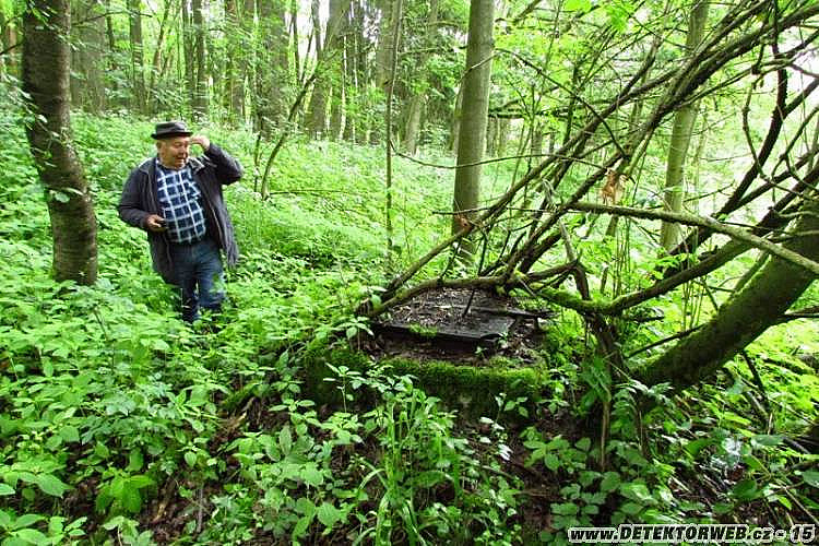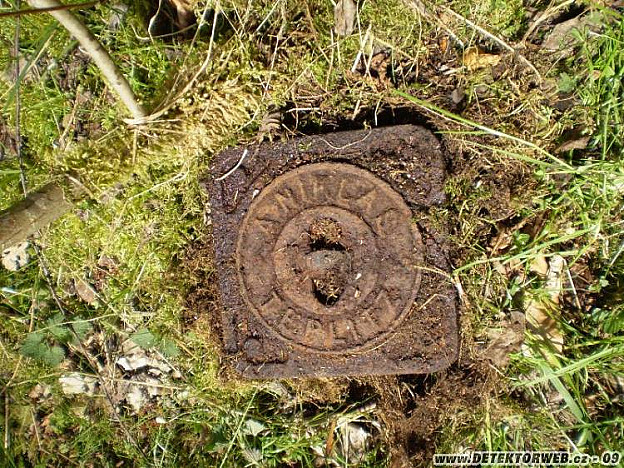 Virgule mne vedla po potrubí a detektorem jsem hledal v zarostlém terénu kdysi nalezené litinové domečky. Najít litinový domeček s nápisem „Stadt Tachau“ se mi ani po důkladném průzkumu nepodařilo. Pod mechem jsem našel jen ten druhý s nápisem „A. NIKLAS – TEPLITZ“. Tento nápis mi umožnil na internetu zjistit, že Adolf Niklas z Teplic začátkem roku 1900 budoval vodovody po celém tehdejším Rakousku-Uhersku.
