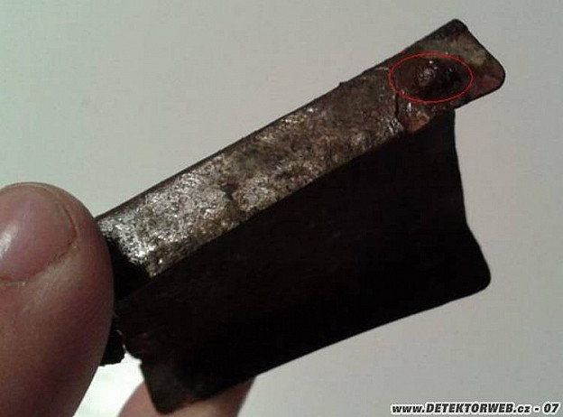 Doma ji opatrně vyčistím a pečlivě zkoumám. Rozměrově opravdu přesně sedí na trofejní kožený opasek Wehrmachtu, který Rusové s oblibou používali. Tentokrát ale Ivan asi neměl žádnou originální přezku, kterou by vybrousil, a tak si ji z mosazného poniklovaného plechu vyrobil sám. Dalo to jistě dost práce, jenomže na to zvolil moc slabý plech (0,8 mm), který rytím hvězdy a přinýtováním železného ouška (z ohnutého hřebíku) pro háček ještě výrazně oslabil. Výsledkem zřejmě bylo, že přezka na německém opasku patrně chvíli držela, ale při větším napnutí (třeba když si sedl) osička ani ouško nevydržely a přezka se rozpadla. Osička s trny se ulomila úplně a ouško tahem háčku prasklo, zčásti se vytrhlo a rozlámalo okraj přezky. (Takže já ji netrefil –uf!! ). Navíc se přezka lehce prohnula podle uhlopříčné ryté linie hvězdy. Rozlámanou přezku Rus zahodil.