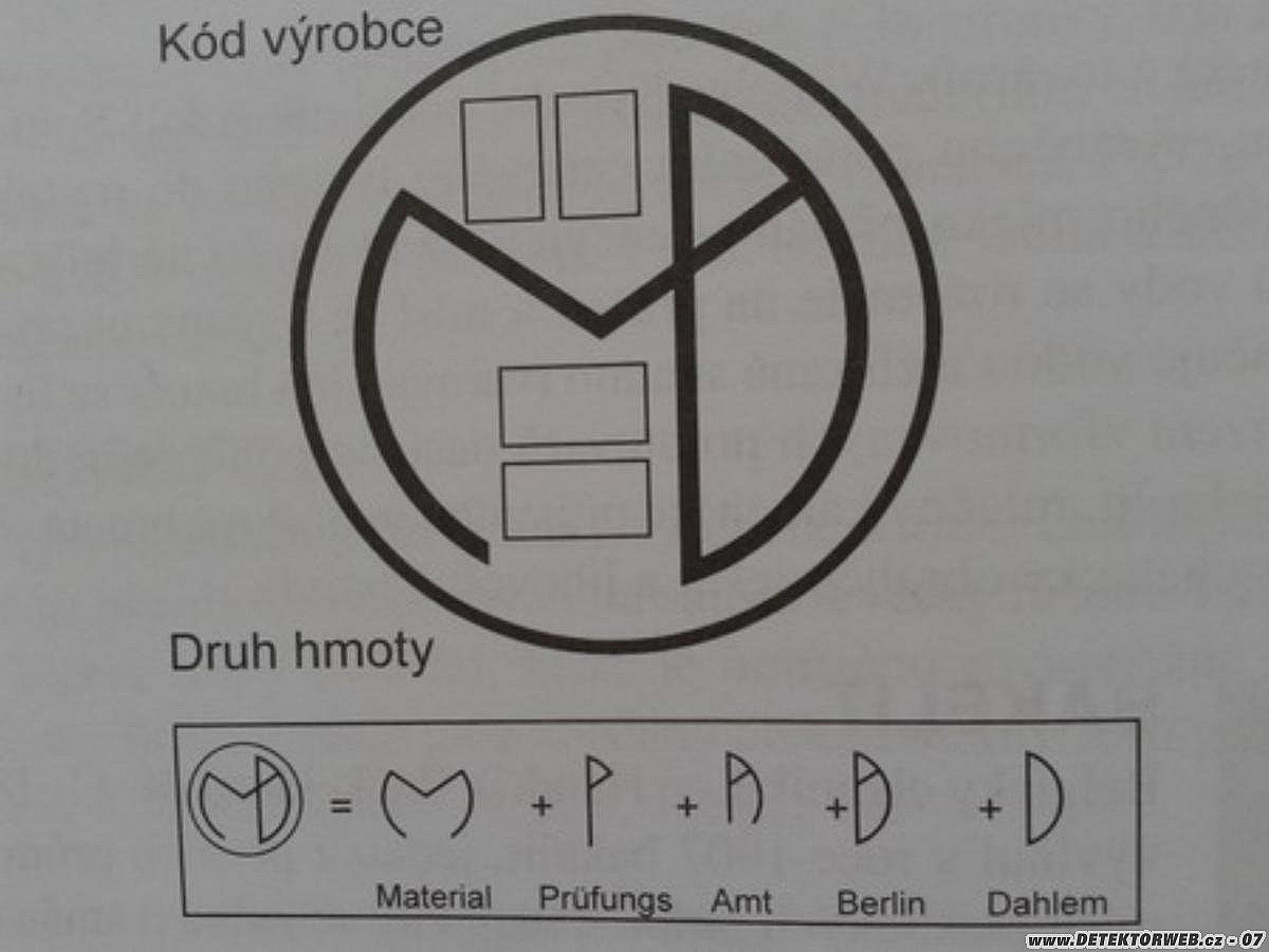 Na vnitřní straně je pod lupou dobře vidět kruhovou značku Zkušebního ústavu materiálů v Berlíně –Dahlemu (Materialprüfungsamt Berlin-Dahlem), který byl pověřen dohledem nad dodržováním norem DIN (Deutsche Industrie Norm) výrobků z umělých hmot. Pod značkou je číslo 1438 (patrně číslo formy). O něco výš je v kroužku i kódové označení výrobce – ehj. Toho se mi bohužel v seznamech přidělených kódů výrobců německého vojenského materiálu dohledat nepodařilo. Parně šlo o nějakou malou bezvýznamnou firmu, jejíž kód se nedochoval. Předmět vlivem vlhka a pobytu v zemi mírně zkřehnul a části plnidla se drolí.