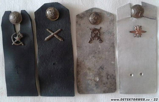 Nevím, jestli se nové nárameníky hned fasovali (podle dobových fotorgafijí mají novou uniformu pouze důstojníci a řadoví vojáci ještě tu se starým značením), ale spíše si myslím, že ne, a tak si je obyčejní vojáci nejspíš vyráběli ze zbytků látky sami a jako výztuhu použili jakýkoliv vhodný pevný materiál, který měli po ruce (jak dokládají i nálezy z rusolágrů) a pak je našili ještě na starou uniformu s límcem vz. 35. Tyhle staré, ručně dělané pogony tak patrně skončily v odpadních jamách ruských táborů z roku 1945 po obdržení nové uniformy vz 43, nebo vyšší hodnosti.