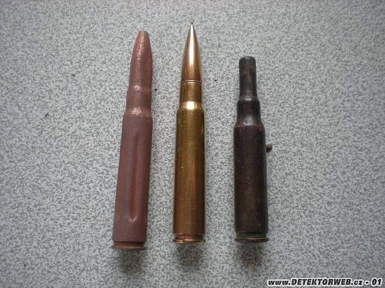 04. 11. 2013, 09:30na prvních 3 fotkách je vlevo německý školní náboj 7,92 mm Mauser, uprostřed je 7,92 mm Mauser, a vpravo cvičný americký náboj 7,62 mm NATO