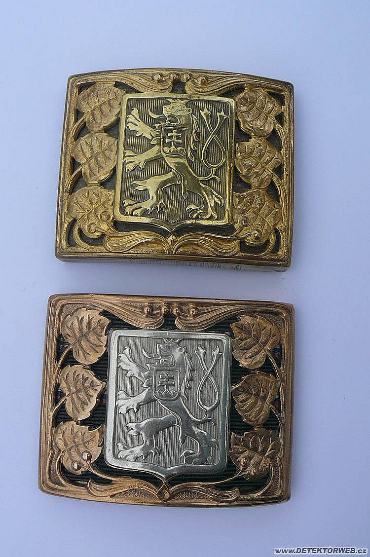 10. 09. 2007, 15:24Horní přezky s lipovým listím jsou k opaskům vz. 25 a nosily se až do roku 1930 u armády. Byly tři podle hosnosti, ale pro důstojníky a generály byly stejné pouze opasková porta byla jiná. Pro rotmistry byl zákad přezky to listí mořené na tmavě hnědo. Znak se lvem byl vždy stříbrný. Takže ten žlutý bych typoval na přeleštěnou mosaz.