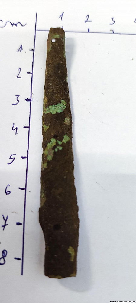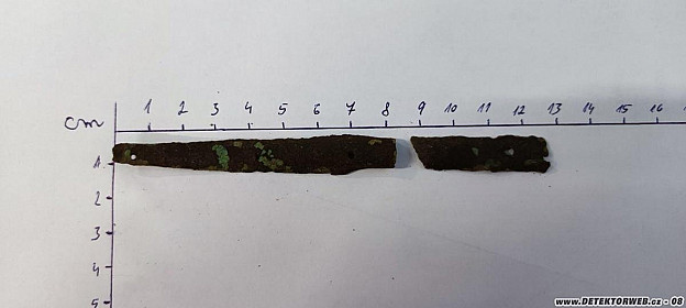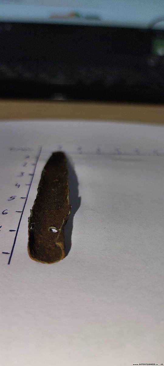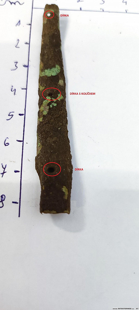 2) Nález je mírně prohnutý plíšek z obecného kovu. Jsou v něm 3 dírky a v prostřední je ještě zbytek nějakého čepu, uchycení... Je rozlomen na dva díly a asi nebyl nalezen kompletní.
