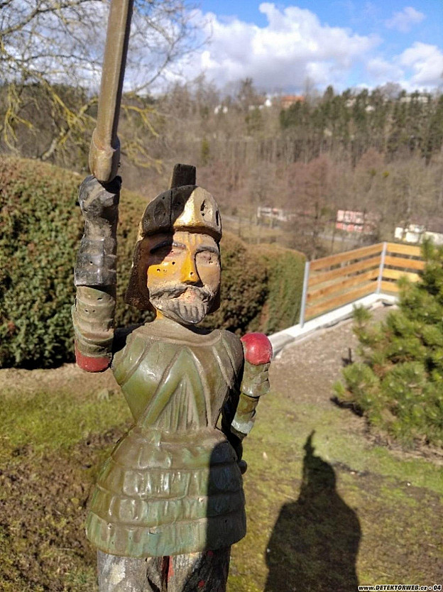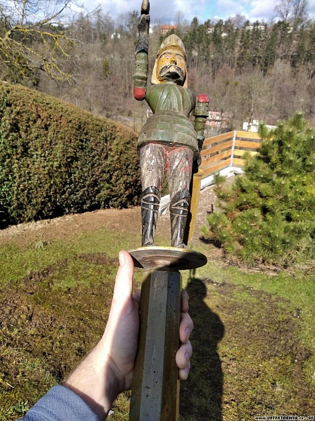 Prosím znalce o případné postřehy a informace. Co mi je zatím známo - jedná se o dřevěnou korouhvičku nebo hračku - materiál lípa. Posazena na desce nezjištěného kovového materiálu (přijde mi to jako cín, nebo olovo ale smícháno s nějakým vláknem?) V podstavci drží korouhvička na trnu - trn chromovaný a je na něm vyraženo velké písmeno R. Jiné značení neobjeveno. Zakoupena v Maďarsku pradědou při návratu z první světové války. Barva nepůvodní. Původní barva převážně stříbrná se zlatými prvky na přilbě a rajtkách. V současné době odborně restaurovaná, ale nikdo z povolaných nikdy nic podobného neviděl, tak zkouším štěstí tady.Díky za případné poznatky a ať se daří.
