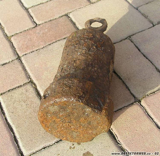 tak jsem také začal hledat. Dnes jsem vyrazil podruhé. Podařilo se najít jen plombu a větší železný předmět válcovitého tvaru s kruhovým "poutkem". Než do toho začnu mlátit kladivem, tak bych se chtěl zeptat na váš názor o původu této věci, jestli nemám volat pyrotechnika. Nalezeno na poli cca 15 cm hluboko.